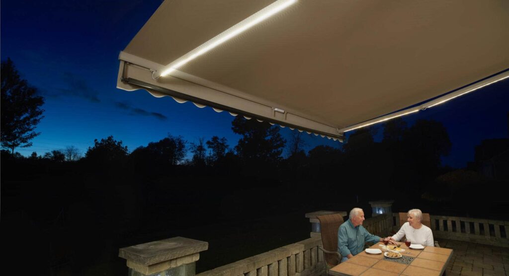 One standout feature of SkyShade Awnings that dealers love to showcase is our built-in dimmable LED lights, a standard offering on all our awnings. These lights are seamlessly integrated into the arms of the awnings, allowing users to adjust the light level with ease using a remote control.